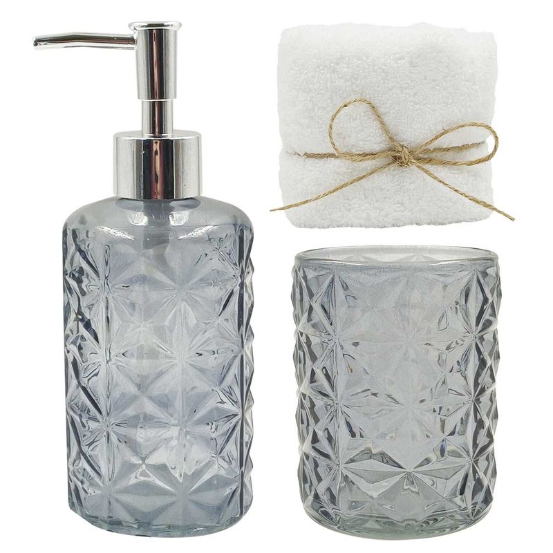 Kit Banheiro - Contém 3 Peças - 1 Porta Sabonete Liquido (18,5cm) - 1 Porta Escova (9,5cm) - 1 Toalha Medidas Embalagem: 20,5cm Composição: Vidro Sanxia Código de Barras: 6976583140027 Peso: 0,749kg Ref: BRSY14002