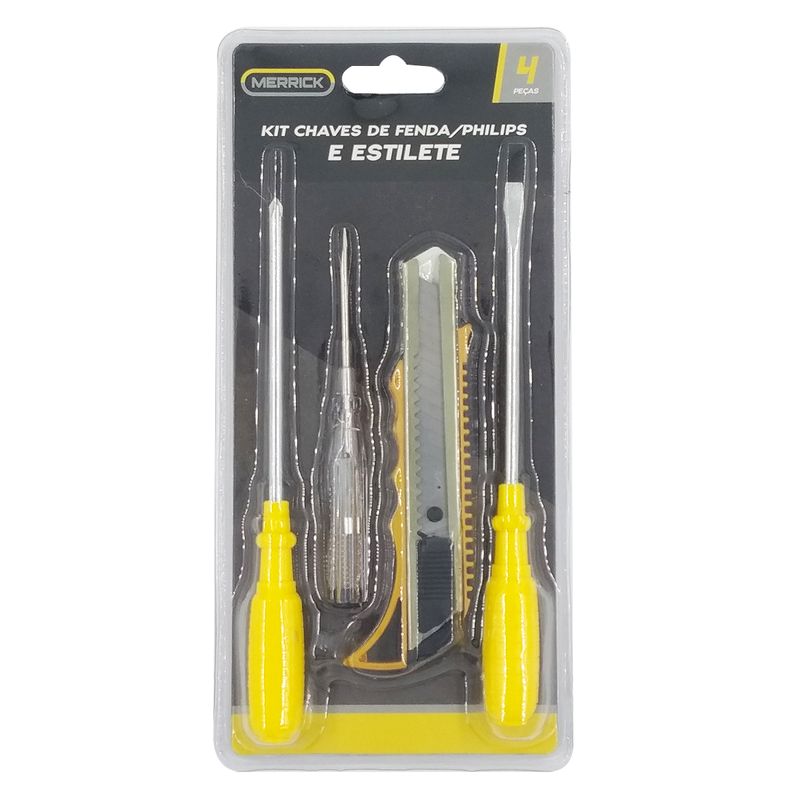 Kit de Ferramentas - Contém 4 Peças - 2 Chaves de Fenda - 1 Chave Philips - 1 Estilete Composição: Metal e Plástico Onyx Código de Barras: 7891100010043 Peso: 0,147 kg Ref: 1004