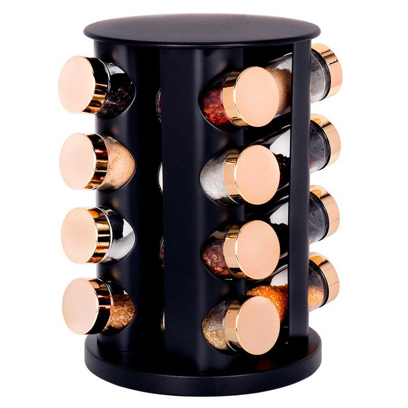 Porta Tempero -Giratório Cor: Preto C/ Tampas Douradas Contém: 16 Peças Composição: Aço Inox Livon Código de Barras: 7891100050162 Peso: 2,205Kg Ref.: 5016
