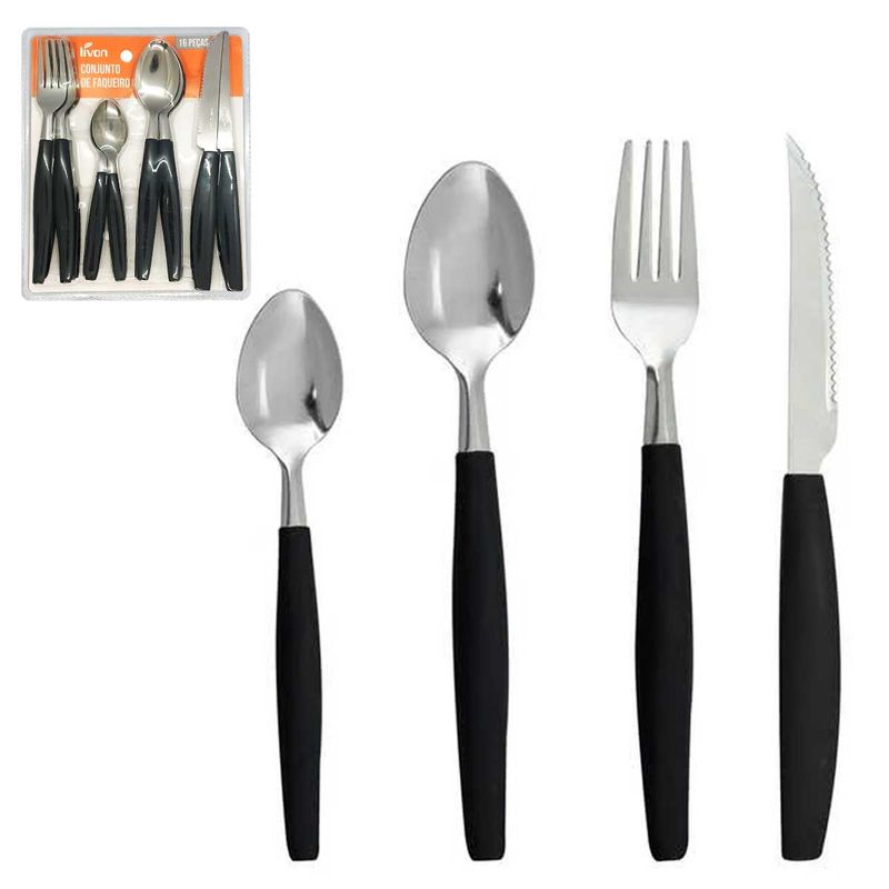 Jogo de Talheres Color - Contém 16 Peças - 4 Collheres de Sopa - 4 Colheres de Sobremesa - 4 Facas - 4 Garfos Medidas: 24x20,5cm Composição: Aço Inox e Plástico Cor: Preto Livon Código de Barras: 7891100058489 Peso: 0,334kg Ref: 5848