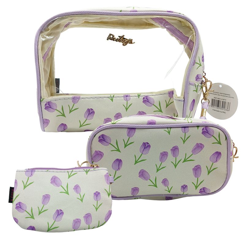 Kit Nécessaire Flores 3 Peças 23x18cm em Poliéster Rubys