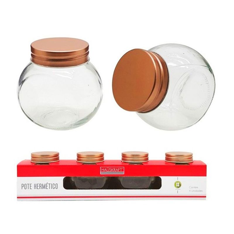 Jogo de Potes Hermético 190ml 4 Peças de Vidro C/ Tampa em Metal Rose Gold Hauskraft