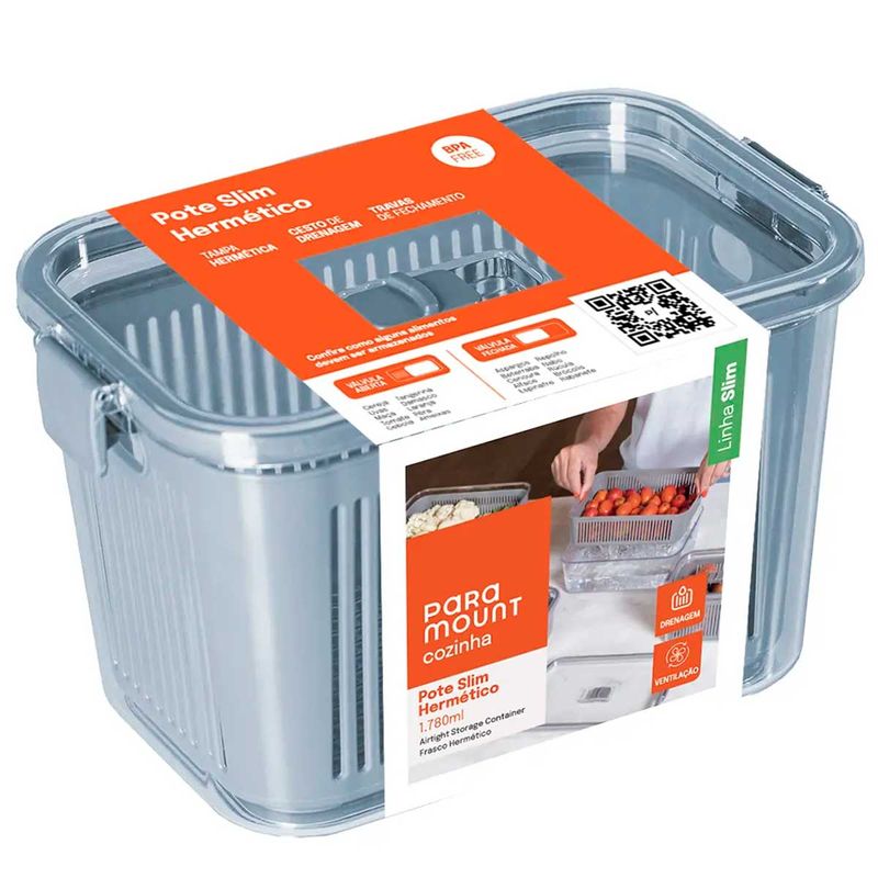 Pote - Slim - C/ Cesto de Drenagem - Ventilação - Tampa Hermética - Travas De Fechamento - Capacidade: 1780ml Medidas: 19,5x12,5x11,9cm Composição: Plástico Cor: Cinza Paramount Plásticos Código de Barras: 7898955005903 Peso: 0,291kg Ref: 1770
