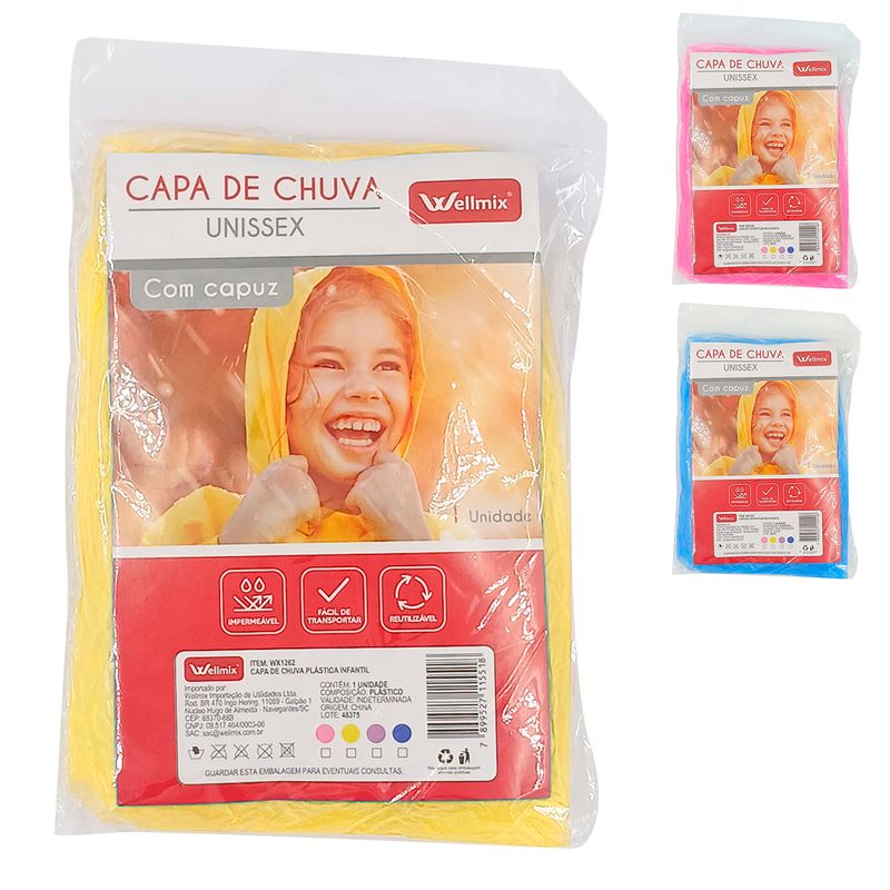 Capa de Chuva Infantil -C/ Capuz -Unissex -Reutilizável -Impermeável -Cores Sortidas Medidas: 40x70cm Composição: Plástico Wellmix Código de Barras: 7899527115518 Peso: 0,022Kg Ref.: WX1262