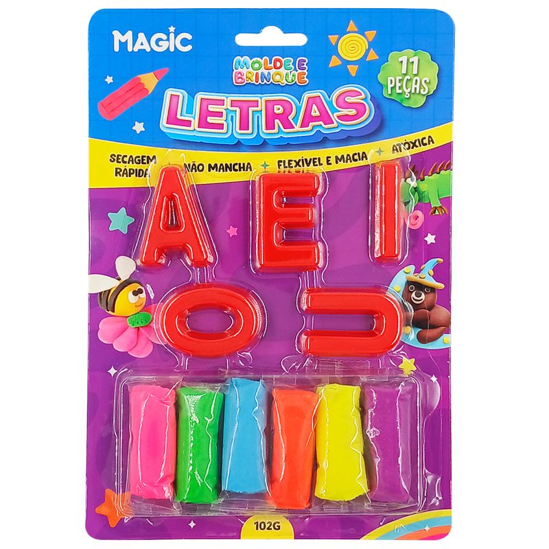 Contém: 11 Peças - 5 Moldes de Letras e 6 Massinhas