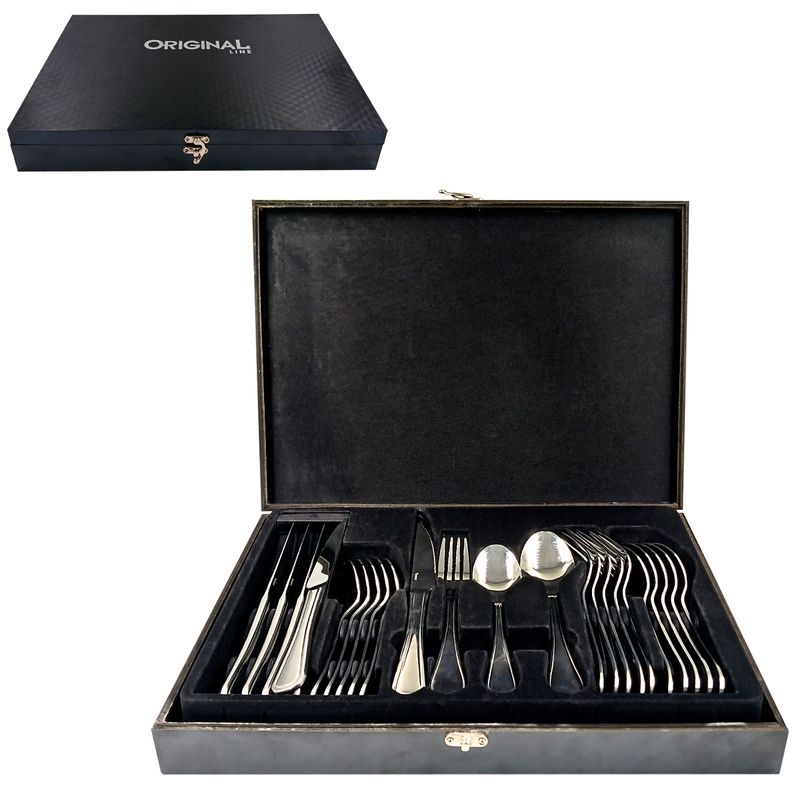 Contém: 24 Peças - 6 Garfos, 6 Facas de Churrasco, 6 Colheres e 6 Colheres de Sobremesa