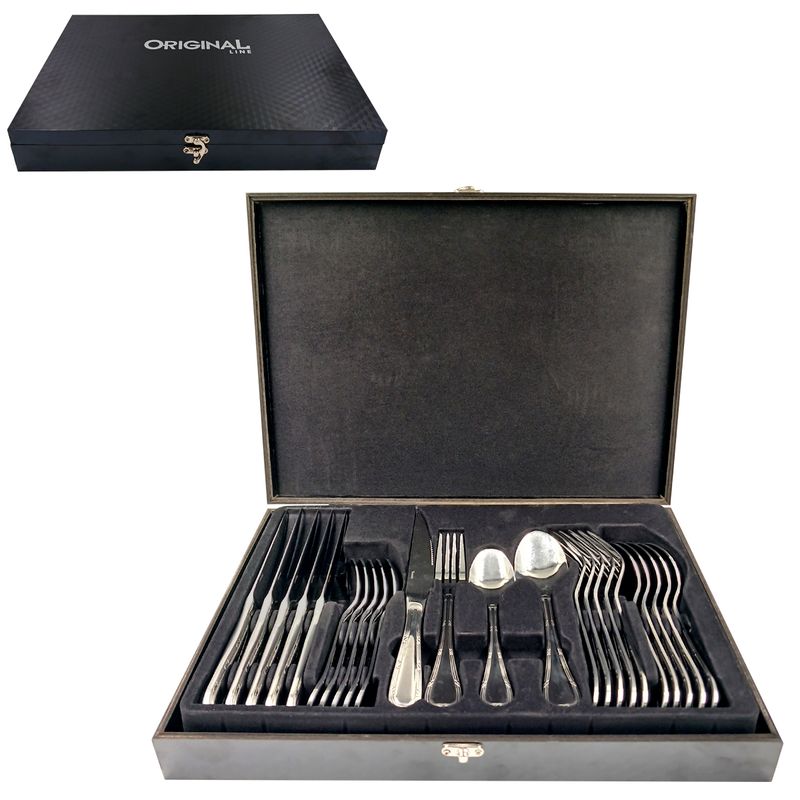 Contém: 24 Peças - 6 Garfos, 6 Facas de Churrasco, 6 Colheres e 6 Colheres de Sobremesa