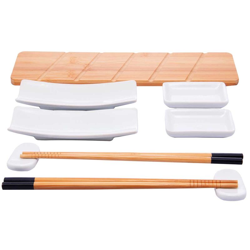 Kit Sushi -Nagoya Contém: 9 Peças - 2 Porta Shoyo 2 Hashi 2 Descansos de Hashi 1 Tábua de Bambu 2 Pratos Composição: Bambu e Porcelana Lyor Código de Barras: 7899768054614 Peso: 0,669Kg Ref.: 5461
