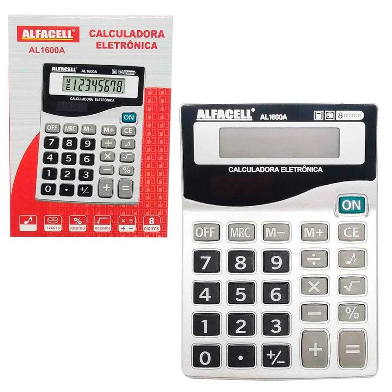 Calculadora Eletrônica de Mesa - 8 Dígitos - 1 Bateria AG10 (Inclusa) Medidas: 10,9x7,9x2,9cm Composição: Plástico Imporiente Código de barras: 7899790928129 Peso: 0,110 Kg Ref: AL1600A
