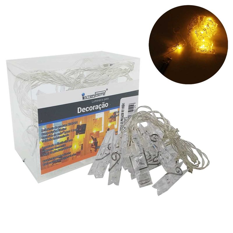 Cordão Pregador Decorativo Plástico e Mini Lâmpadas de Led 2 Pilhas AA (Não Inclusa) Luz Amarela 2m InterPonte Código de barras: 7908174901365 Peso: 0,035 Kg Ref: HD67412