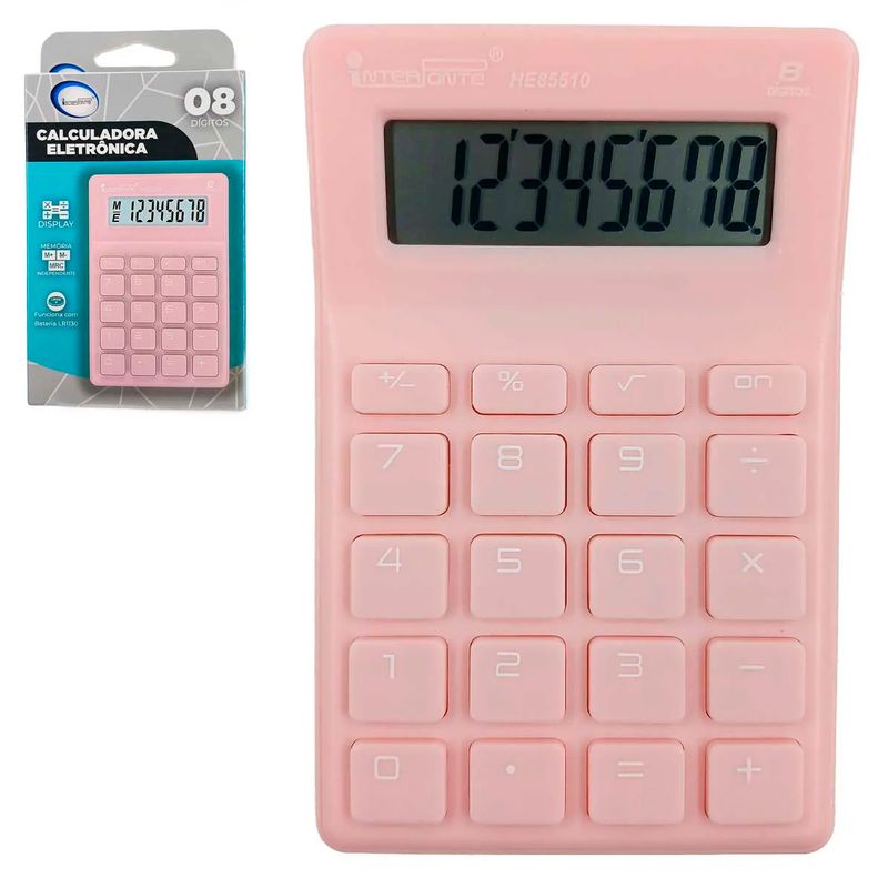 Calculadora de Mesa -8 Dígitos -Alimentação 1 Bateria 1,5V (Inclusa) Medidas: 12,5x8x1,7cm Composição: Plástico Interponte Código de Barras: 7908174947479 Peso: 0,060Kg Ref.: HE85510