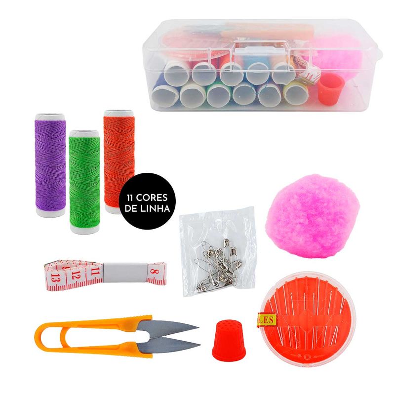 Contém: 34 Peças - 11 Tubos de Linha, 10 Agulhas, 1 Mini Tesoura, 1 Fita Métrica, 10 Alfinetes e 1 Almofada P/ Agulhas.