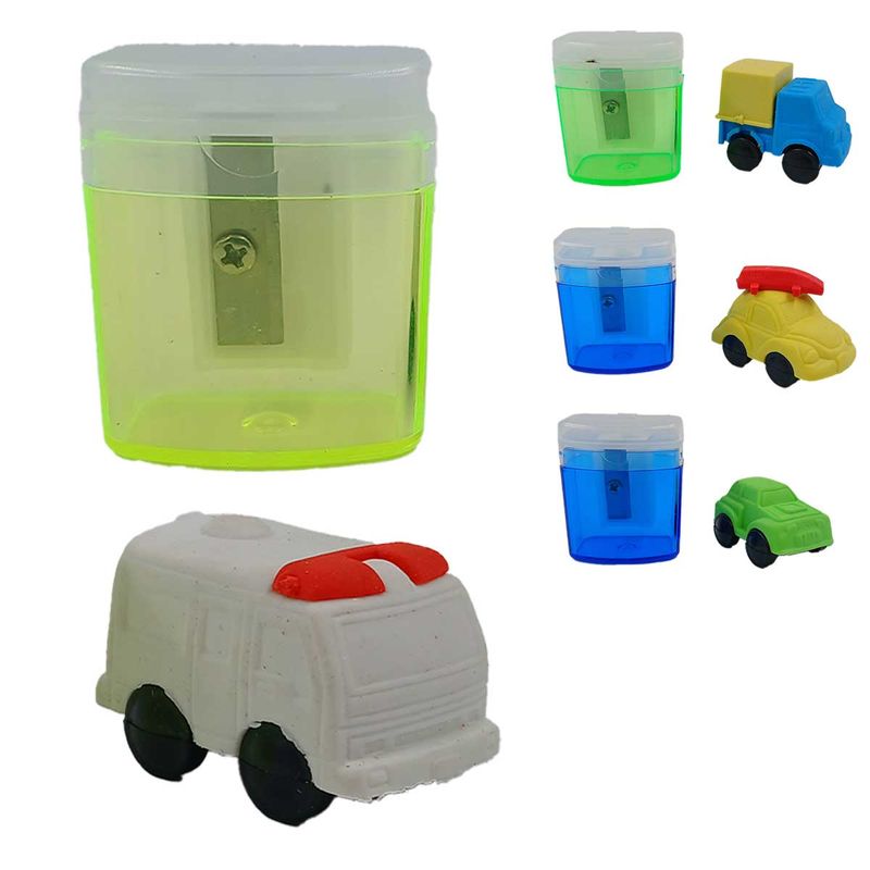 Kit Apontador + Borracha Carro 2 Peças em Plástico Interponte