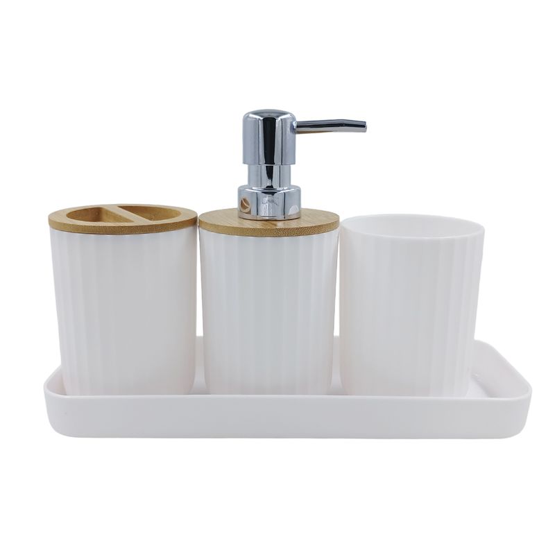 Medidas: Porta Sabonete Líquido - 7,5x7,5x16cm; Porta Escova - 7,5x7,5x11cm; Copo - 7,5x7,5x10cm; Suporte - 9x25cm