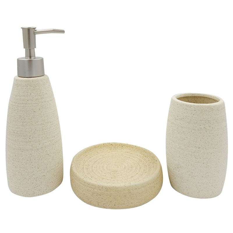 Kit Banheiro - Linha Berlim - Contém 3 Peças - 1 Dispenser (350ml) - 1 Porta Escova (12,5cm) - 1 Saboneteira (12) Composição: Porcelana Newway Código de Barras: 7908501007890 Peso: 1,057kg Ref: HVY0789