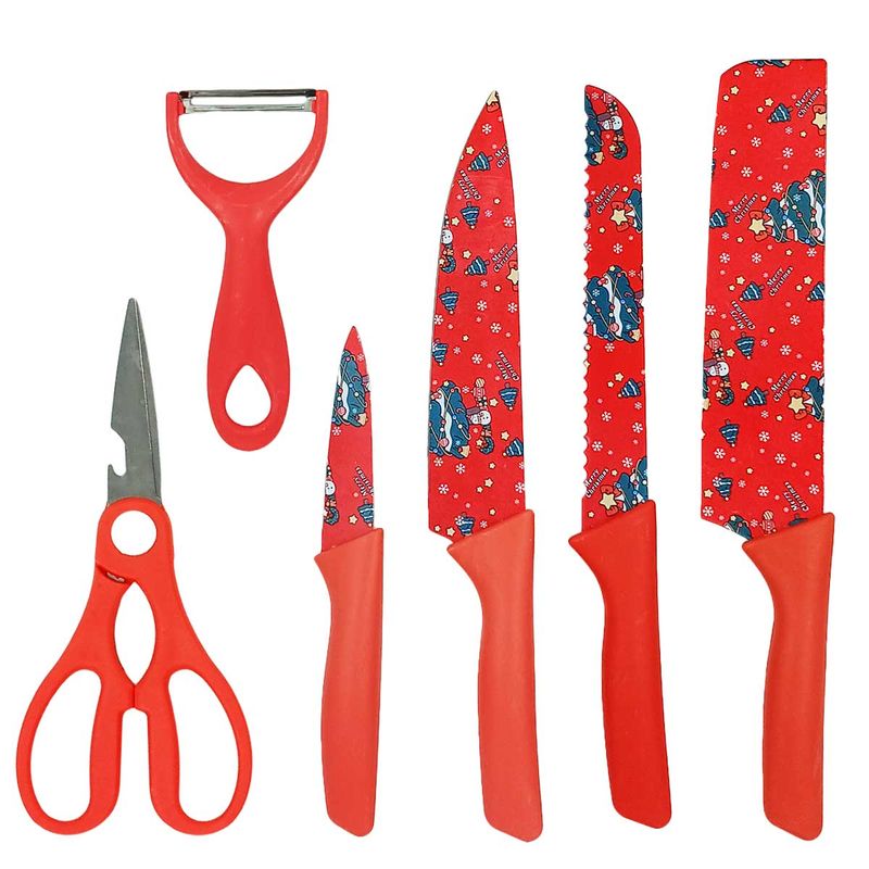 Jogo de Facas -Natalinas -Estampada Contém: 6 Peças - 1 Cutelo, 1 Faca do Cheff, 1 Faca de Pão, 1 Faca de Precisão, 1 Tesoura e 1 Descascador Composição: Metal e Plástico Kehome Código de Barras: 7908630240151 Peso: 0,282Kg Ref.: 9645