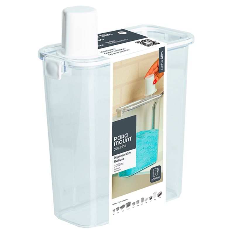 Dispenser Slim -Multiuso -C/ Dosador Capacidade: 3390ml Composição: Plástico Paramount Plásticos Código de Barras: 7908692517123 Peso: 0,384Kg Ref.: 4389