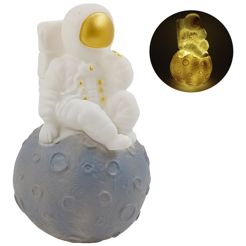 Luminária -Astronauta na Lua-Decorativa-Luz Amarela-Alimentação 3 Baterias LR44 (Inclusas)Medidas: 10,5x10,5x17cm Composição: Plástico Fu XingCódigo de Barras: 7908732315160Peso: 0,115KgRef.: DT5259