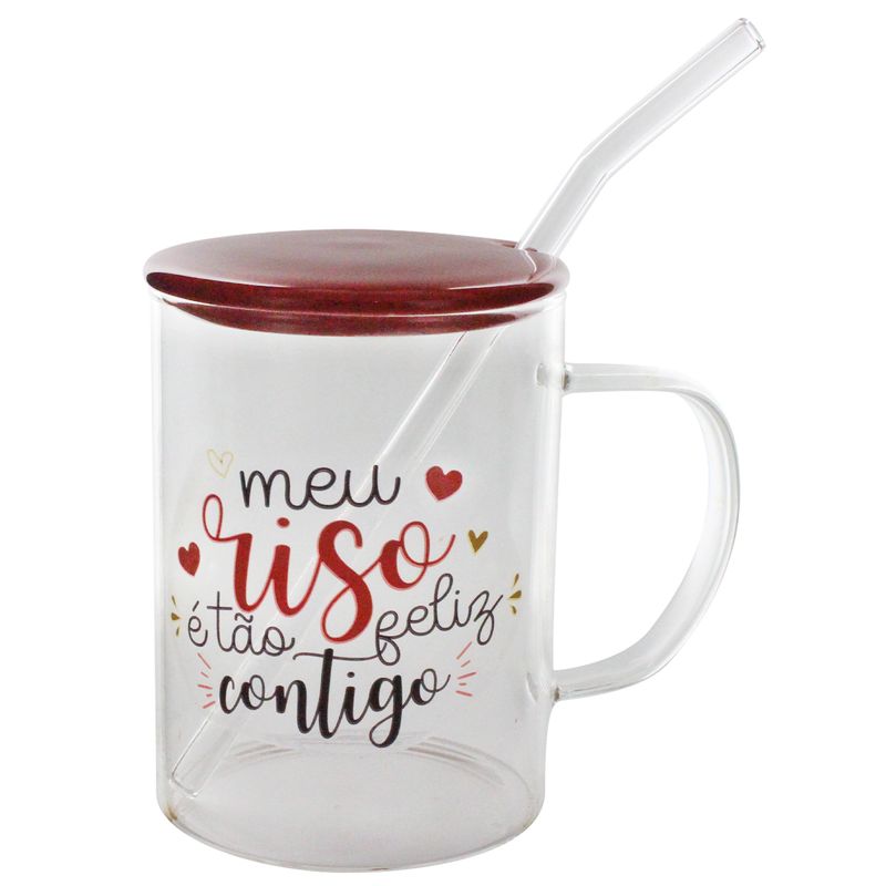 Caneca Amor C/ Tampa + Canudo 430ml em Vidro Fu Xing