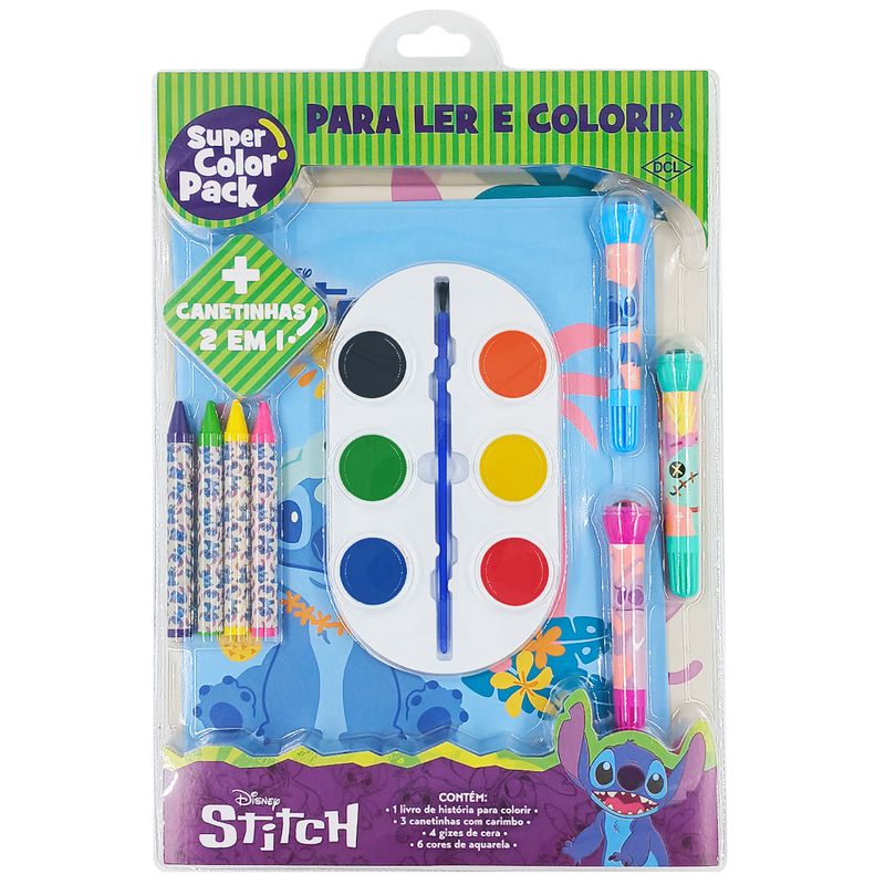 Livro Super Pack -Stitch -P/ Ler e Colorir Contém: 1 Livro de História P/ Colorir 3 Canetinhas C/ Carimbo 4 Gizes de Cera 6 Cores de Aquarela Medidas: 26x20,5cm Composição: Papel DCL Editora Código de Barras: 9786556583044 Peso: 0,244Kg Ref.: D8307
