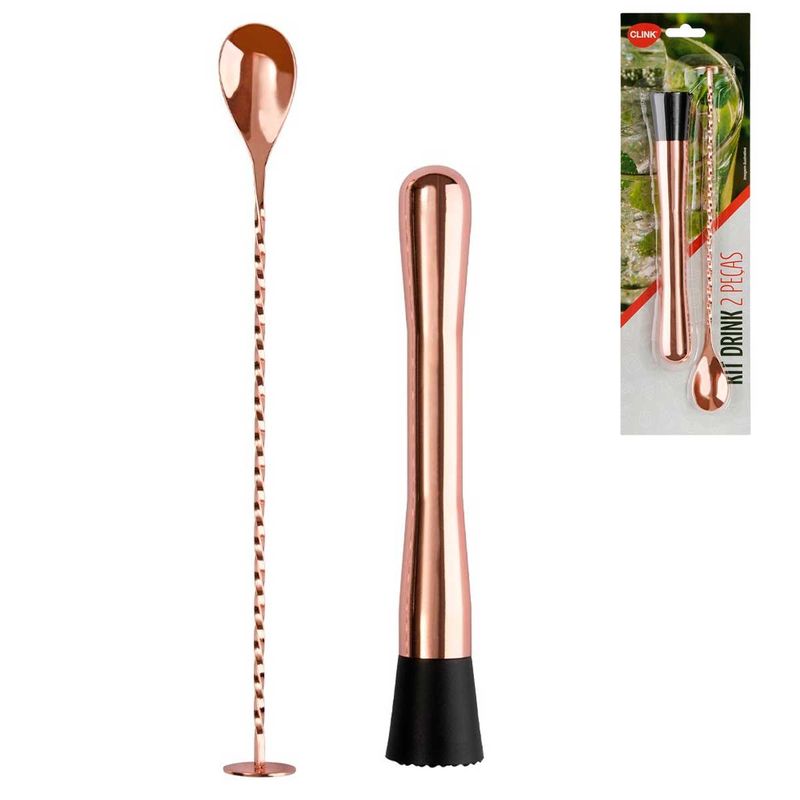 Kit Drink 2 Peças: - 1 Socador ( 20cm ) - 1 Colher ( 25,5cm ) Cor: Rose Gold Composição: Aço Inox Clink Código de Barras: 7899850346535 Ref: CK5721 Peso: 0,130 Kg